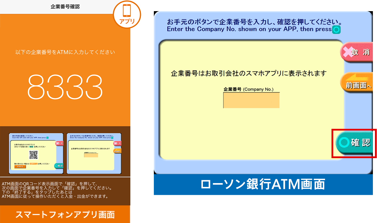 アプリに表示された企業番号をATMに入力、[確認]を選択