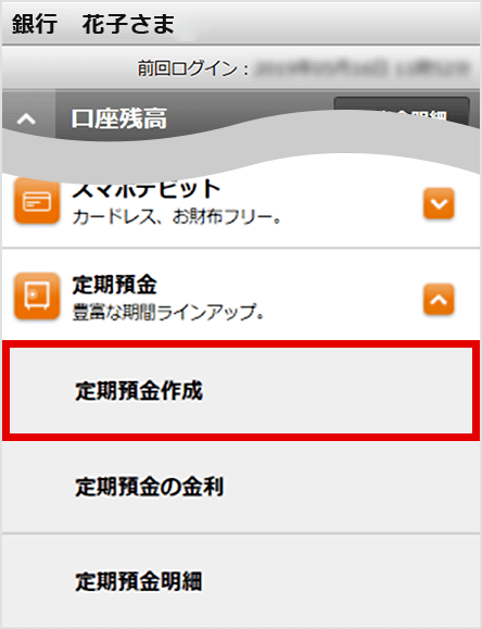 ログインして、定期預金メニューから「定期預金作成」を選択