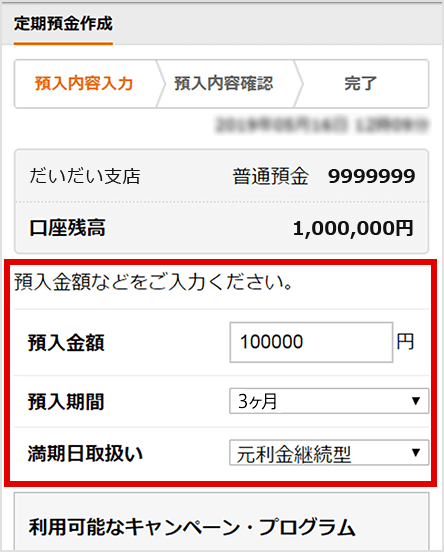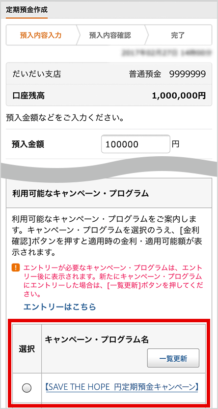円定期預金作成方法とキャンペーン選択方法