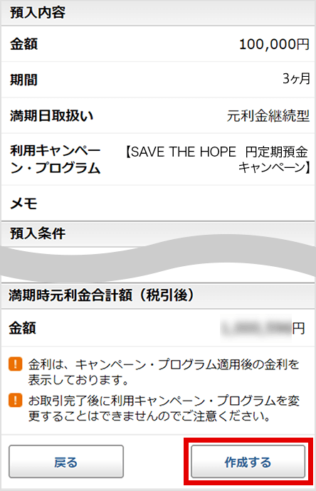 預入内容を確認し、[作成する]を選択して完了