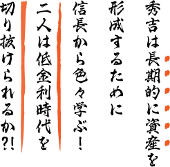 慎重だがチャンスはものにする好奇心旺盛な秀吉。資産運用について、信長から詳しく教えてもらう。