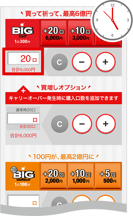 • BIGの当せん金最高6億円はキャリーオーバー発生時であり、通常は1等最高3億円となります。なお、特別開催回は除きます。MEGA BIGの当せん金最高12億円はキャリーオーバー発生時。通常は1等最高7億20円。 100円BIGの当せん金最高2億円はキャリーオーバー発生時であり、通常は1等最高1億円となります。いずれも当せん金額は、売上金額や当せん口数によって変動します。