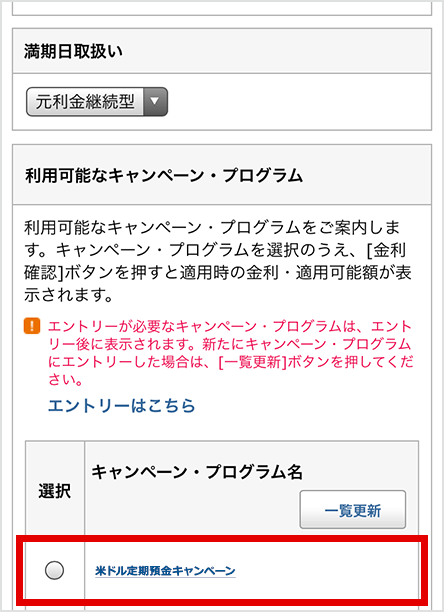 お取引時に表示される【利用可能なキャンペーン・プログラム】にて、【米ドル定期預金キャンペーン】を選択してください。