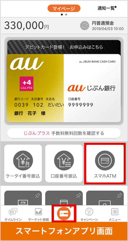 スマートフォンアプリにログインし、画面下部中央の[マイページ]から[スマホATM]を選択