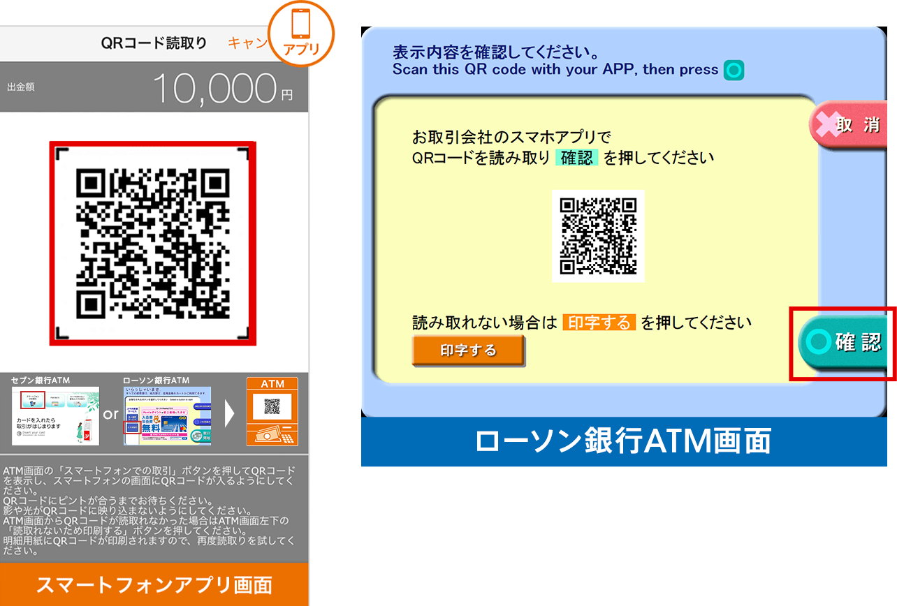 ATM画面に表示されるQRコードをアプリで読取り、ATM画面の[確認]を選択