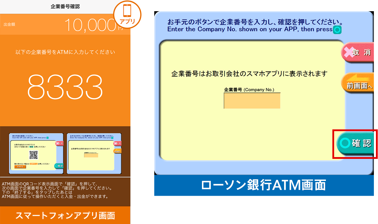 アプリに表示された企業番号をATMに入力、[確認]を選択