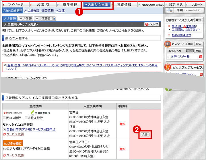 なお、auマネーコネクトによる三菱UFJ eスマート証券への入金方法は、三菱UFJ eスマート証券のログイン後画面からお手続きいただけます。詳細は以下をご覧ください。