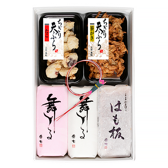 独特な食感とお魚の深い味わいが楽しめる舞鶴伝統のかまぼこ「舞づる」「はも板」や、食感が楽しい3種の「ちぎり天」が入ったバラエティ豊かなギフトセットです。