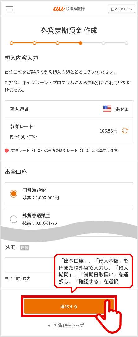 - 詳しくは、外貨預金の詳細および契約締結前交付書面を必ずご確認いただき、お取引ください。