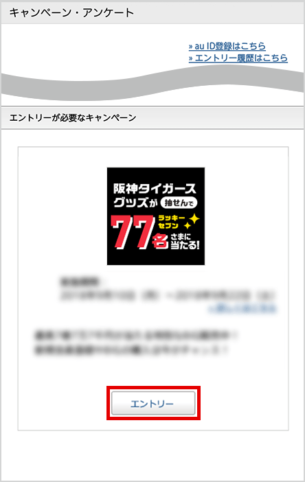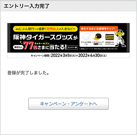 「auじぶん銀行への入金で阪神タイガースグッズ当たるキャンペーン」を選んでエントリーボタンを押す