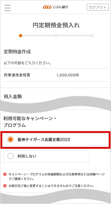 - お取引時に表示される[利用可能なキャンペーン・プログラム]にて【阪神タイガース応援定期2022】を選択してください。