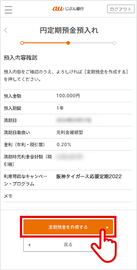 預入内容を確認し、[定期預金を作成する]を選択して完了