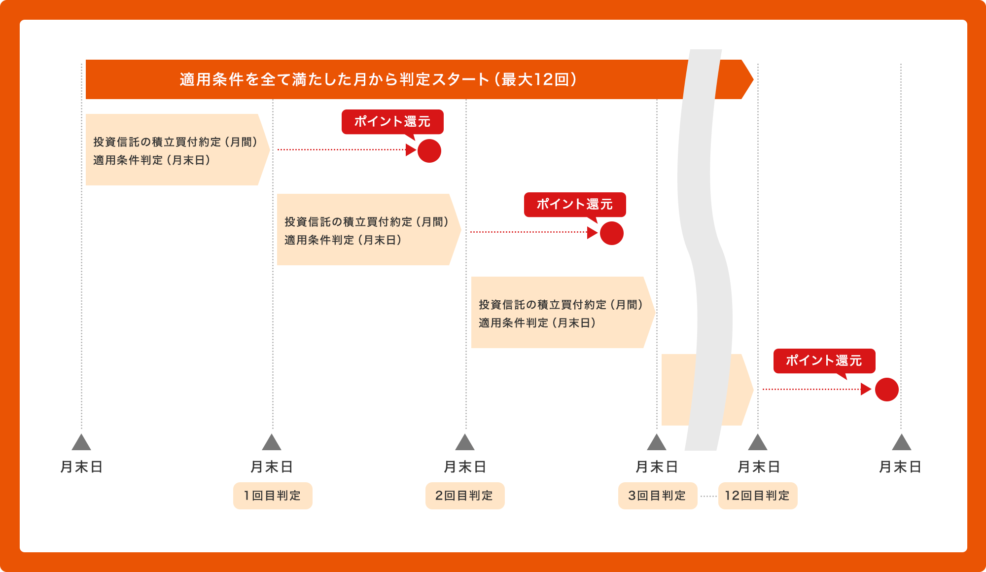 - 投資信託の積立が複数約定されている場合、判定月に約定された金額の合算額に対して特典を計算いたします。