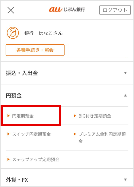 ログイン後、画面左上のメニューより、円預金の「円定期預金」を選択