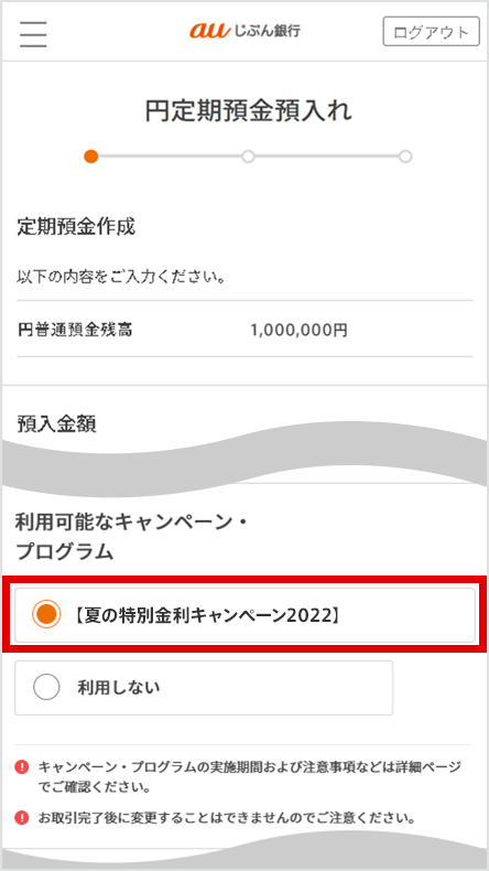 [満期日取扱い]の下の[利用可能なキャンペーン・プログラム]にて、【夏の特別金利キャンペーン2022】を選択