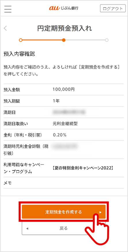 預入内容を確認し、[定期預金を作成する]を選択して完了