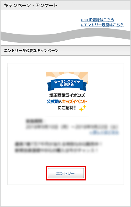 「合計50組100名様に当たる!埼玉西武ライオンズ試合観戦チケット&キッズイベントご招待キャンペーン!」を選んでエントリーボタンを押し、ご希望の試合を選択