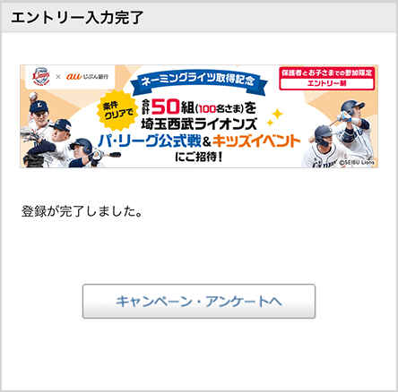 抽せんで埼玉西武ライオンズ ペア観戦チケット(auじぶん銀行フィールドビューシート)を各試合ごとに25組(50名さま)、合計50組(100名さま)にプレゼント