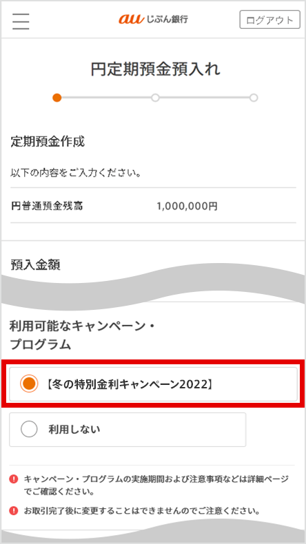 [満期日取扱い]の下の[利用可能なキャンペーン・プログラム]にて、【冬の特別金利キャンペーン2022】を選択