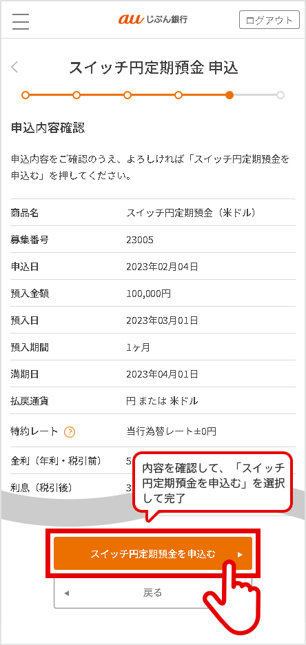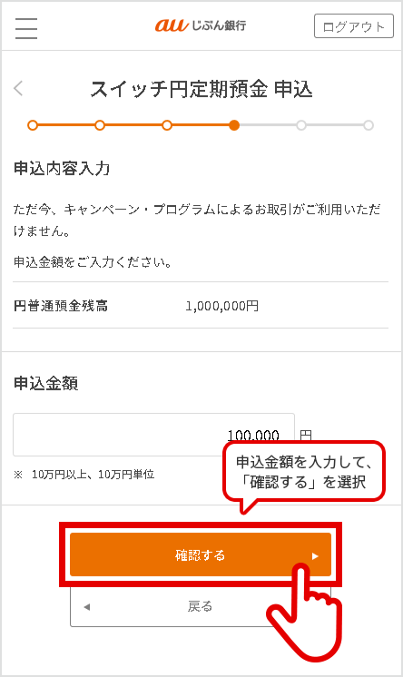 スイッチ円定期預金の合計預入金額が100万円のため、4,000円の現金プレゼントとなります。