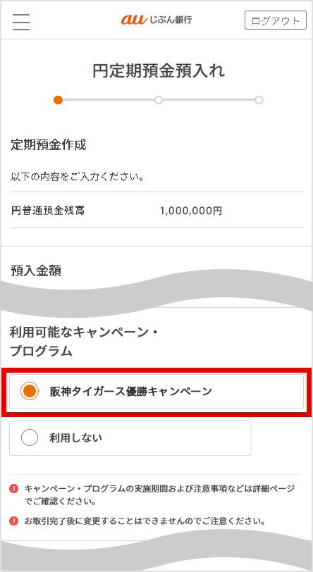 [満期日取扱い]の下の[利用可能なキャンペーン・プログラム]にて、【阪神タイガース優勝キャンペーン】を選択