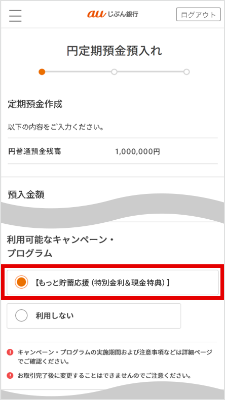 - 本キャンペーンの特別金利を適用するためには、お取引時に表示される[利用可能なキャンペーン・プログラム]にて【もっと貯蓄応援(特別金利&現金特典)】を選択してください。