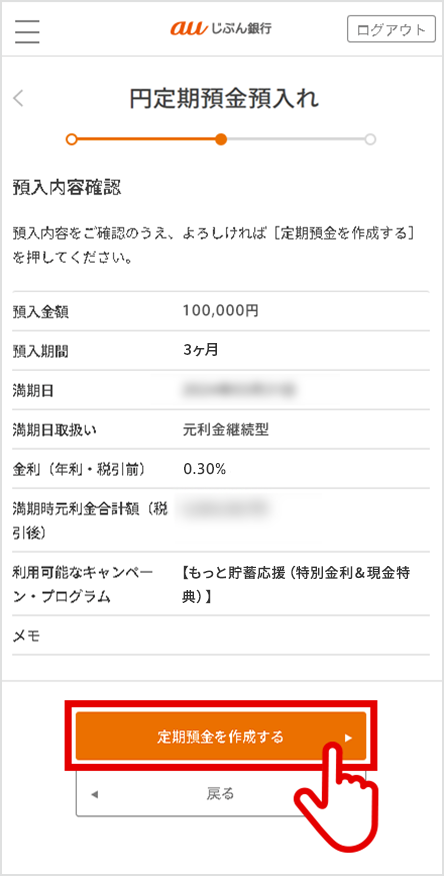 預入内容を確認し、[定期預金を作成する]を選択して完了