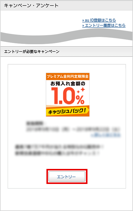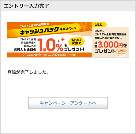 キャンペーンページのエントリーボタンを押してログイン後、「プレミアム金利円定期預金キャッシュバックキャンペーン」を選んでエントリーボタンを押す