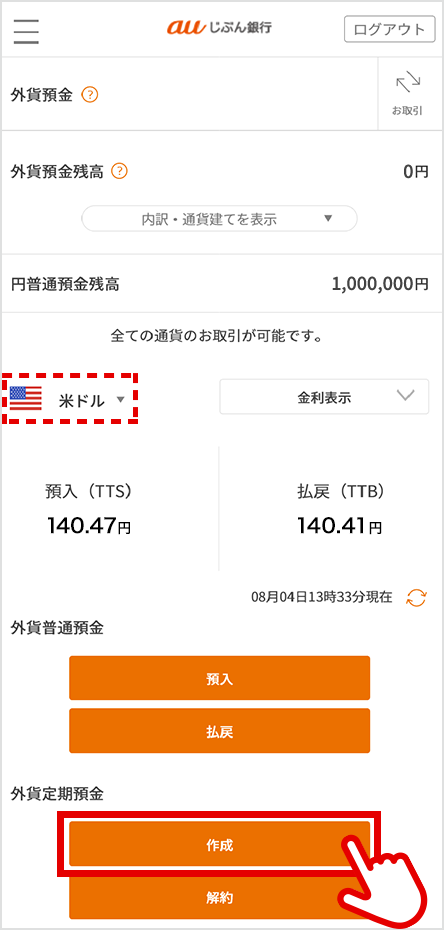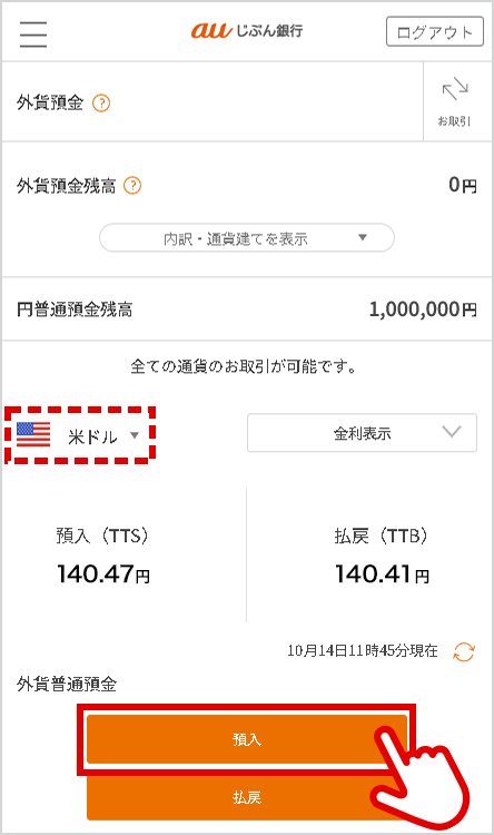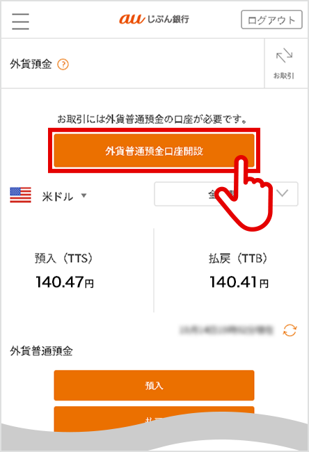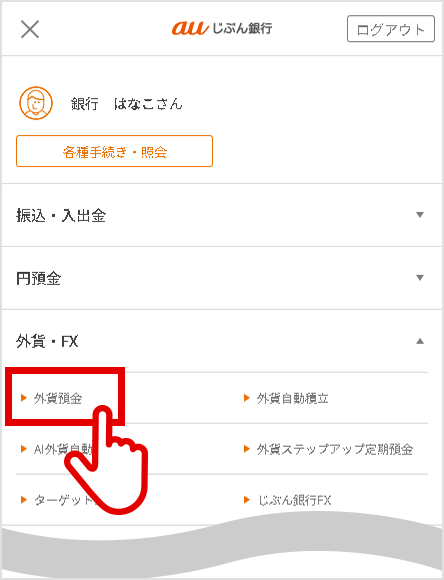 ログイン後、画面左上のメニューより、外貨・FXの「外貨預金」を選択