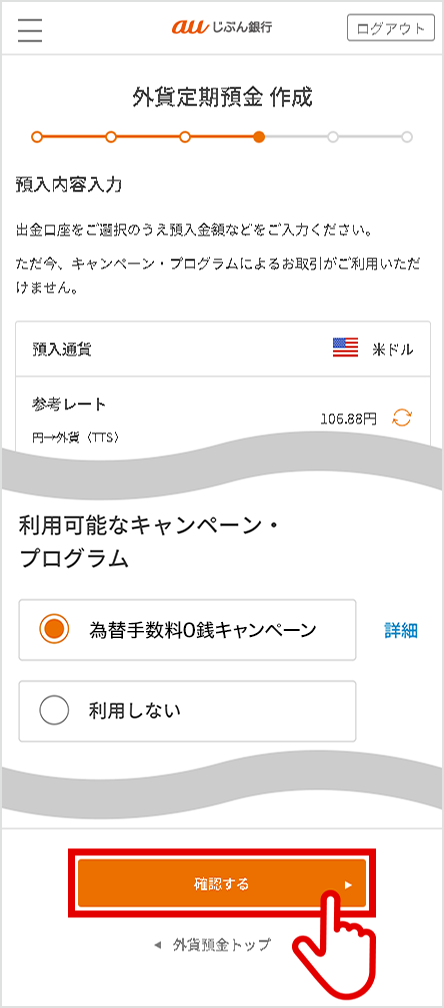 ただし、お取引時に表示される[利用可能なキャンペーン・プログラム]にて【為替手数料0銭キャンペーン】を選択したお客さまが当キャンペーンの対象となります。 -