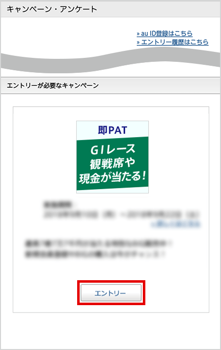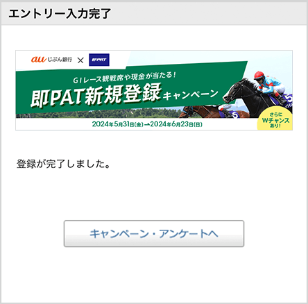 キャンペーンページのエントリーボタンを押してログイン後、「GⅠレース観戦席や現金が当たる!即PAT新規登録キャンペーン」を選んでエントリーボタンを押し、特典を選択。