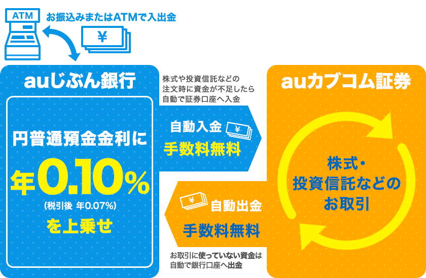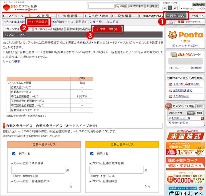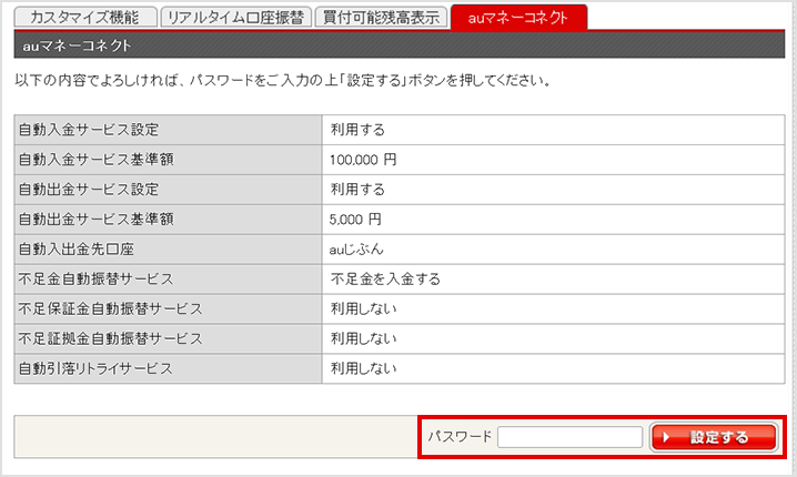 auマネーコネクト設定方法auじぶん銀行とauカブコム証券口座開設後に、お客さま自身でauカブコム証券のログイン後画面から設定いただく必要があります。以下のリンク先の案内に従って設定してください。