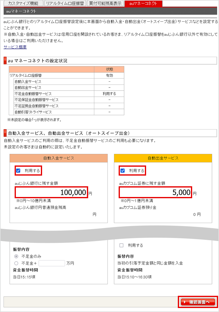 - auじぶん銀行または、auカブコム証券口座のお申込み内容不備により、いずれかの口座を再申込する必要が出た場合は、auマネーコネクトは自動で設定されません。両口座開設後に、auカブコム証券のログイン後画面から手動で設定してください。