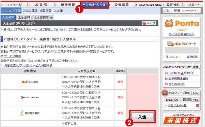 なお、auマネーコネクトによるauカブコム証券への入金方法は、auカブコム証券のログイン後画面からお手続きいただけます。詳細は以下をご覧ください。