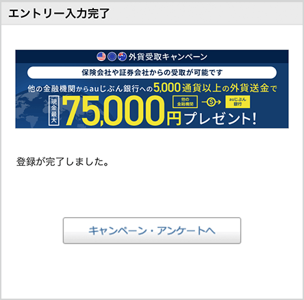 期間中にキャンペーンにエントリーのうえ、他の金融機関からauじぶん銀行へ外貨送金していただいたお客さまに、当社へ入金された金額に応じて、現金最大75,000円をプレゼントします。