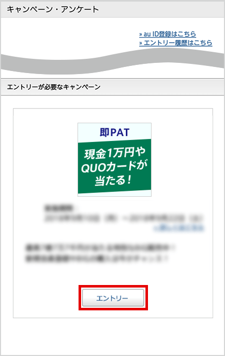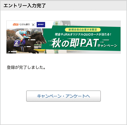 キャンペーンページのエントリーボタンを押してログイン後、「現金・JRAオリジナルQUOカードが当たる!秋の即PATキャンペーン」を選んでエントリーボタンを押す。