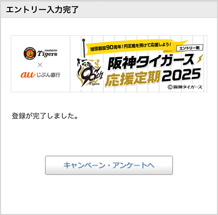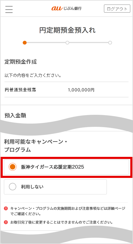 本商品のお預入れは、お取引時に表示される[利用可能なキャンペーン・プログラム]にて【阪神タイガース応援定期2025】を選択いただくことで、キャンペーン金利を適用いたします。 -