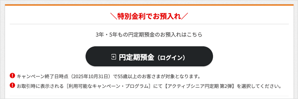 お取引時に表示される[利用可能なキャンペーン・プログラム]にて「アクティブシニア円定期 第2弾」を選択のうえ、100万円以上お預入れすること。