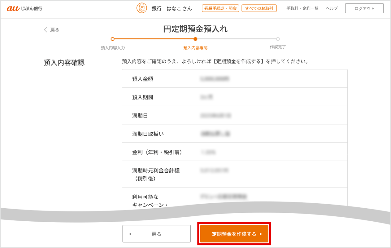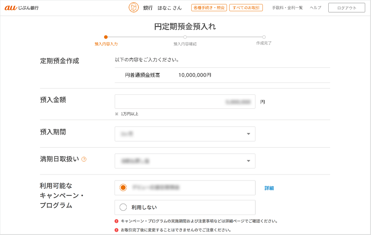 [預入金額]を入力し、[預入期間]、[満期日取扱い]を選択