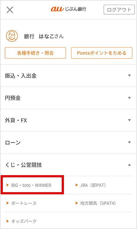 「BIG・toto・WINNER」メニュー購入履歴・当せん結果画面よりご確認ください。じぶん銀行totoアプリの場合