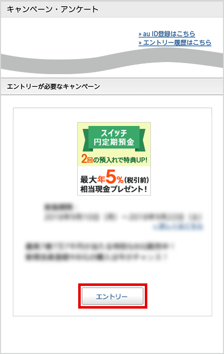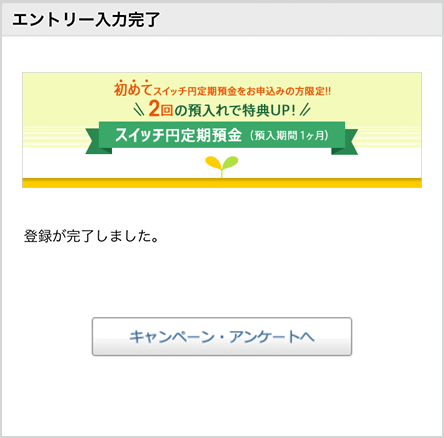 本ページ内のエントリーボタンを押してログイン後、「2回の預入れで特典UP!スイッチ円定期預金新規取引応援キャンペーン」を選んでエントリーボタンを押す
