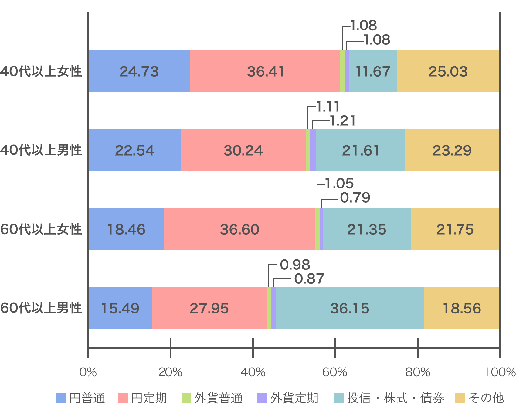 次に、金融資産の内訳をみていきましょう。注目すべきは、投信や株式、債券といった有価証券の占める割合です。60代以上男性は40代男性に比べて1.5倍以上、60代以上女性は40代女性に比べて2倍近くも有価証券の占める割合が増えています。