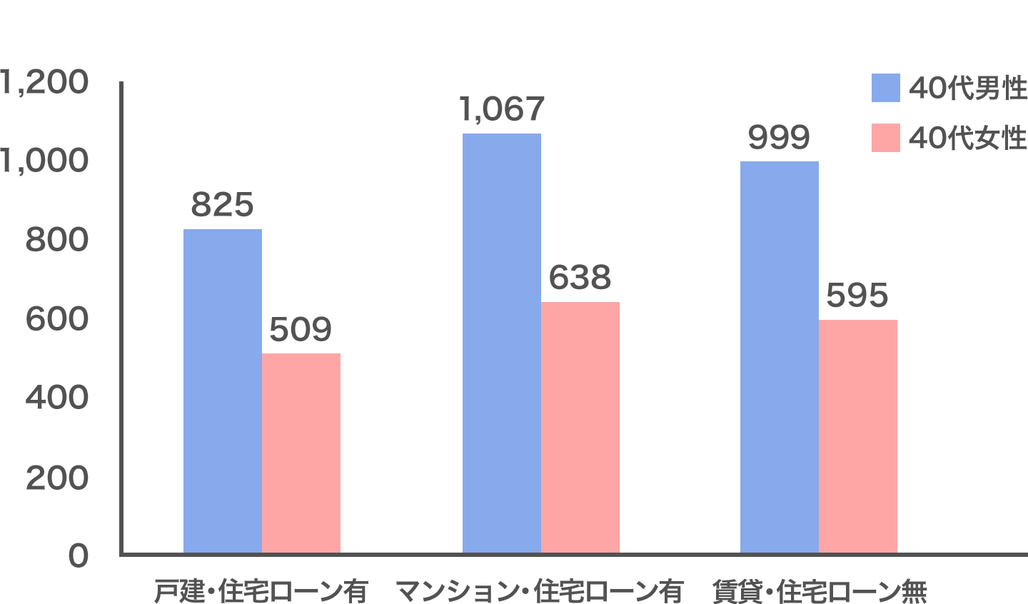 回答者の40代の男女約3万人を、住宅ローンの有無と住宅様式(戸建、マンション)によってグループに分けて、その金融資産額について調べました。