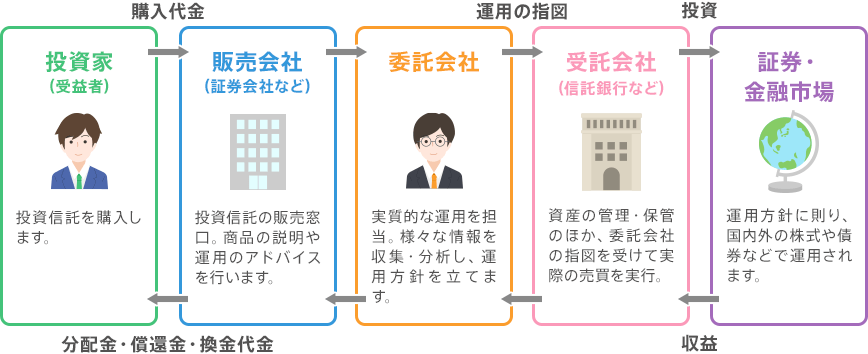 契約型の投資信託は、委託会社(投資信託委託会社)、受託会社(信託銀行)、販売会社(証券会社や銀行など)、投資家(受益者)から成り立っています。