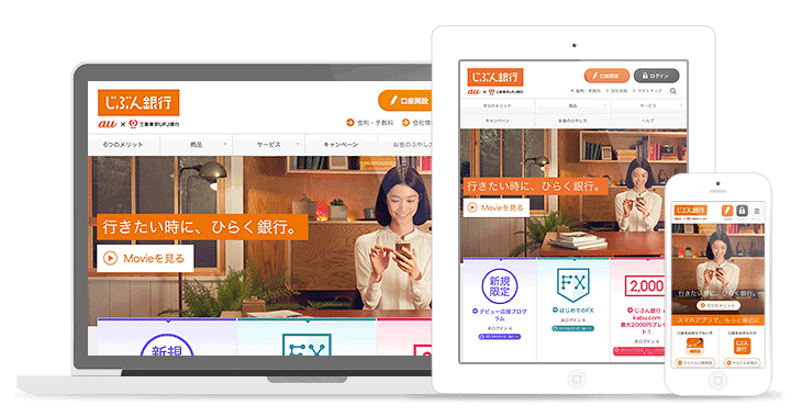 - レスポンシブWebデザインとは、スマートフォン、タブレット、パソコンなどアクセスする様々な端末の画面サイズに合わせて、ウェブサイトを表示する方法のひとつです。今回のレスポンシブWebデザインの導入により、お客さまのご利用環境に関わらず、同じ情報量でありながら、それぞれの端末に最適な表示を行うことが可能になりました。様々な端末で、ストレスなくじぶん銀行ウェブサイトをご覧いただけます。