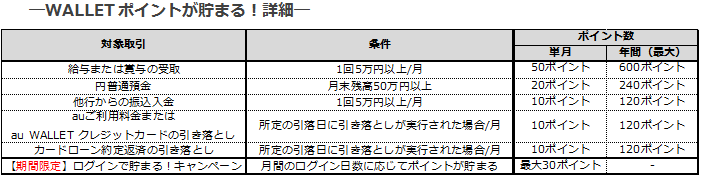 本特典では、「じぶん銀行」における給与または賞与の受取、auご利用料金やau WALLET クレジットカードの引き落とし、円普通預金の残高など、各種取引に応じて毎月WALLET ポイントが貯まります※4