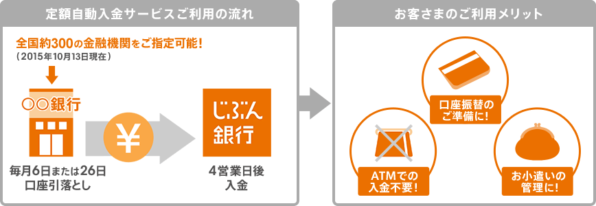 株式会社じぶん銀行(本社:東京都中央区、代表取締役社長:鶴我 明憲、以下「じぶん銀行」)は、2015年10月11日(日)より、「定額自動入金サービス」の提供を開始しました。