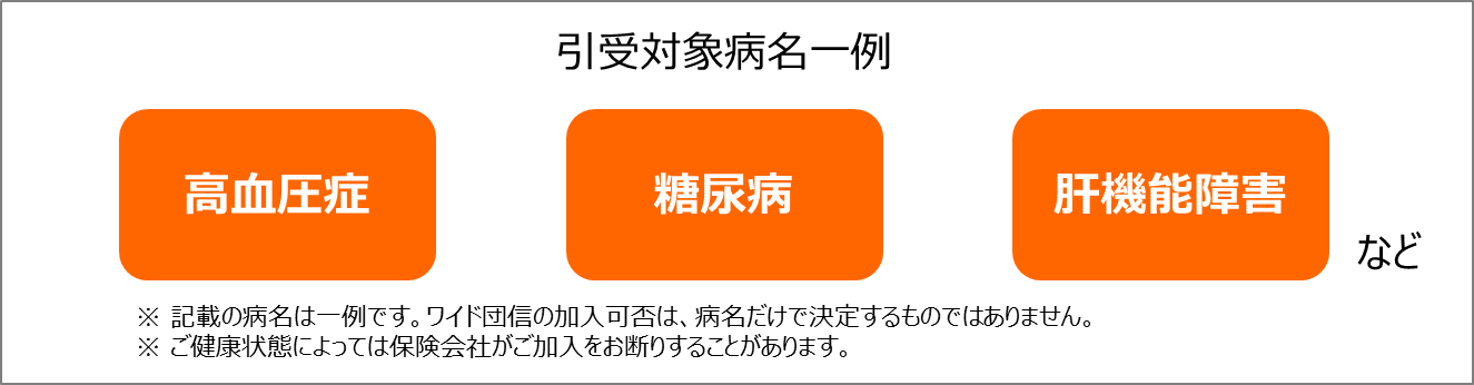 「ワイド団信」では、これまでの団体信用生命保険よりも引受範囲を拡大しており、健康上の理由から団体信用生命保険のご加入が認められなかったお客さまにも、一定の範囲でご加入いただけます。「ワイド団信」にご加入の場合、借入金利に年0.3%を上乗せします。