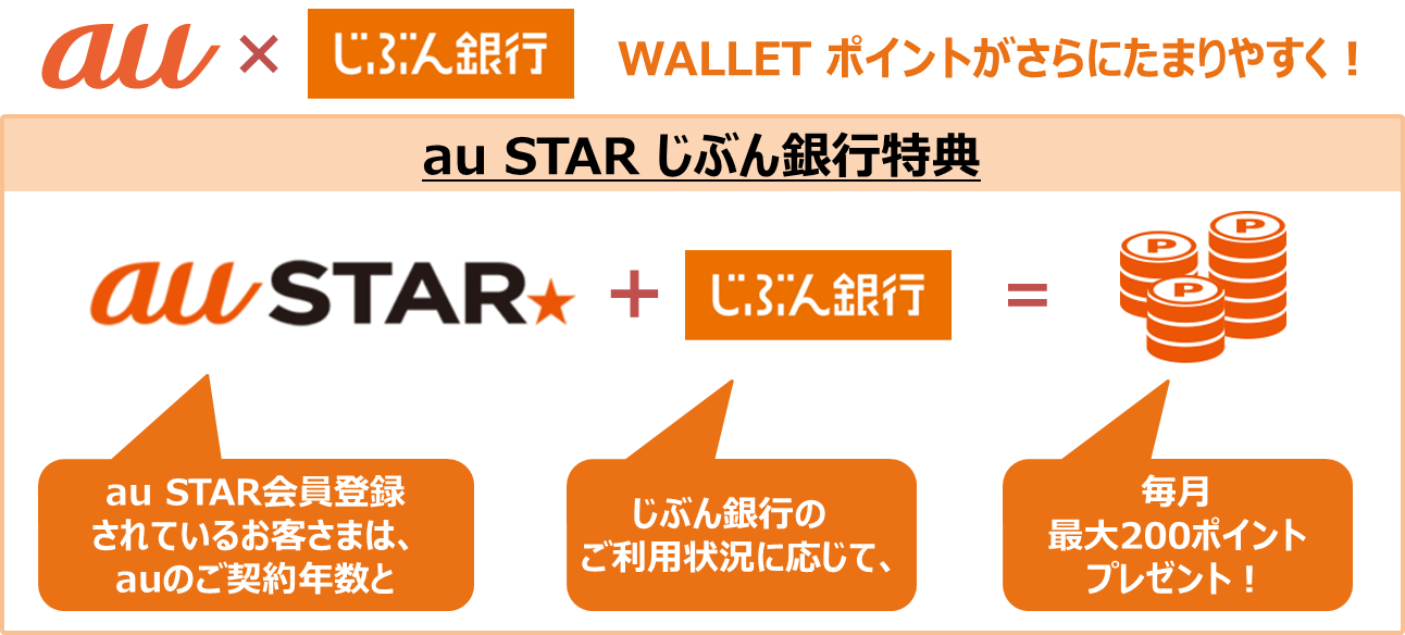 「au STAR じぶん銀行特典」は、じぶん銀行に口座をお持ちのお客さまのうち、「au STAR」会員の方を対象に、じぶん銀行のご利用状況に応じて、毎月WALLET ポイントを最大200ポイント付与する特典です。auのご契約年数が長いほど、もらえるポイントが多くなります。
