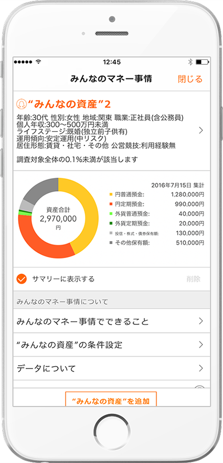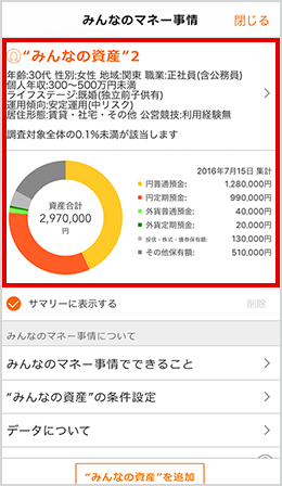 サマリーページで「みんなのマネー事情」をタップすると上記ページが表示され、プロファイル条件の設定により金融資産データを探索できます。最大5種類の探索結果データを保存できます。
